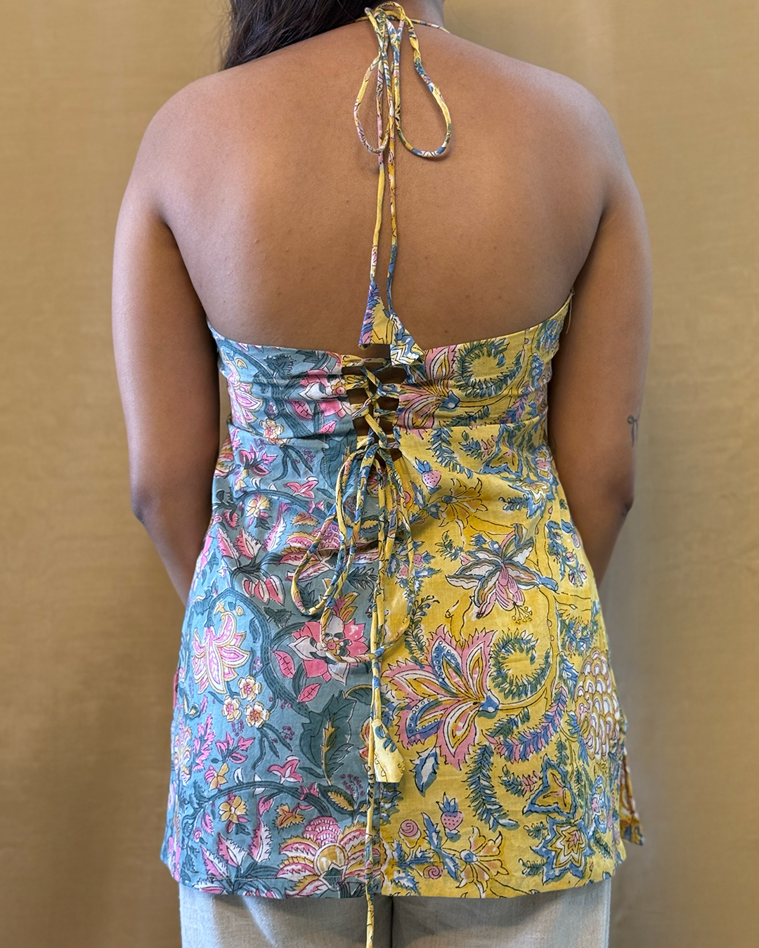 Gul, our hand block printed dual-pattern short kurti in refreshing green and violet floral prints, is not your usual short kurti. With a halter neck, tie-up sleeves, and a criss-cross tie at the back, it elevates everyday style with effortless charm, comfort, and flair all in one.
