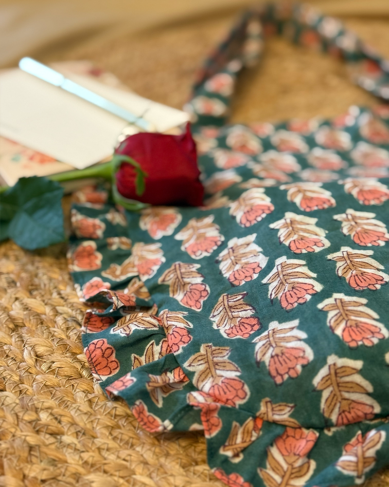 Hand block printed in soft floral cotton, this green mini tote features playful side frills and just the right amount of charm. Cute, handy, and perfect for all your everyday essentials.