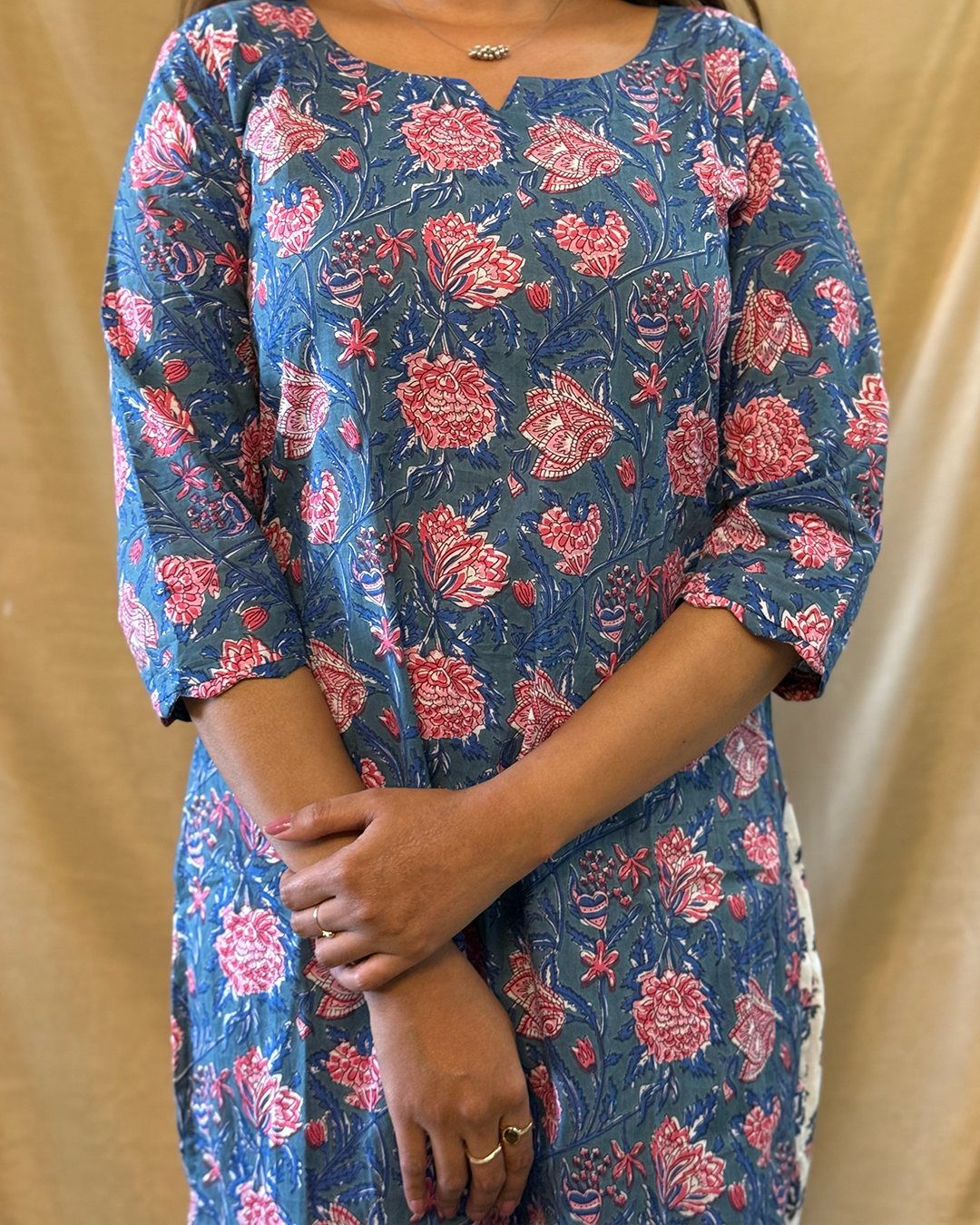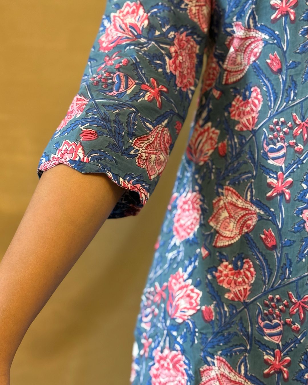 Komal is crafted in soft cotton with a light blue and white floral print that feels fresh and calming. Designed with a flattering U-neck and gentle scalloped sleeves, the top pairs with cigarette straight pants for an easy, balanced silhouette. Light on the skin, Komal brings little comfort and quiet elegance together perfect for slow days and everyday moments.